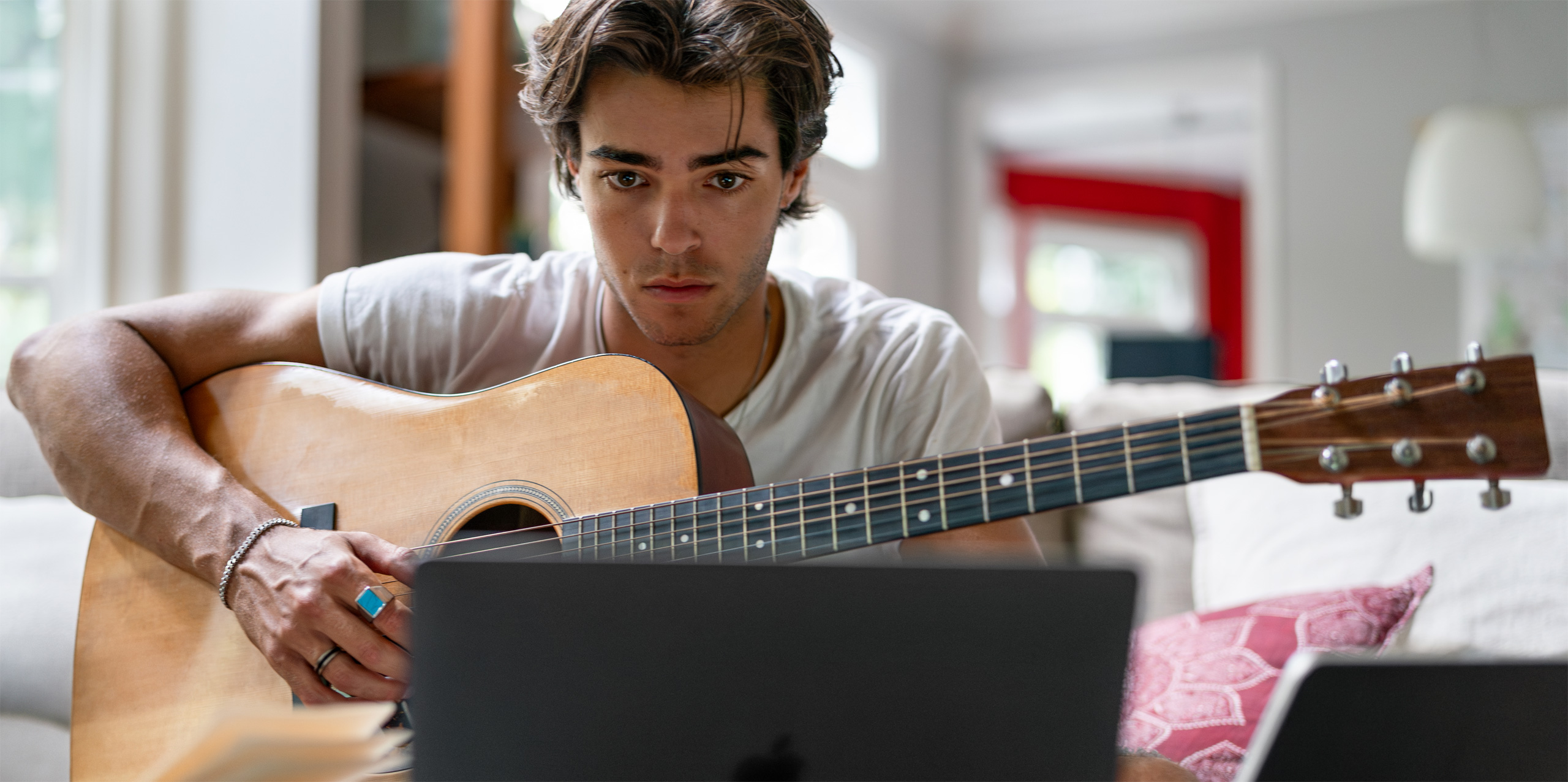 Wie viele andere Studierende musste sich auch Max an das Lernen zu Hause gewöhnen. Dabei verlässt er sich mehr denn je auf sein MacBook Pro. Mit professioneller Produktionssoftware wie Logic Pro ist das MacBook Pro der perfekte Begleiter und alles, was er braucht, um aus seinem Schlafzimmer ein Tonstudio zu machen.