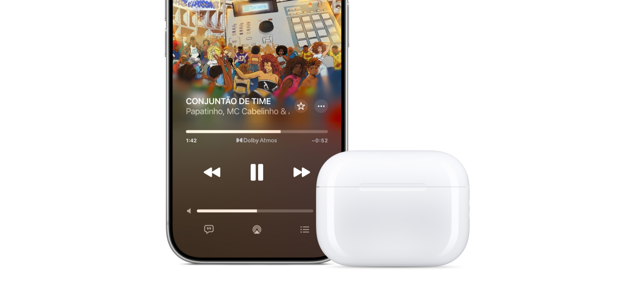 Nova arquitetura acústica multiportas com controle de fluxo de ar mais preciso e um microfone voltado para dentro apontando diretamente para o canal auditivo. Os AirPods geram graves mais profundos, maior clareza vocal e uma amplitude maior de som para você ouvir cada nota.