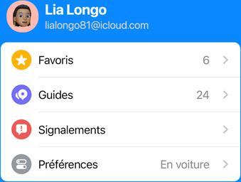 Ouvrez Plans et touchez la photo de votre compte en bas de l’écran pour afficher en un seul et même endroit vos réglages les plus utilisés – comme votre mode de transport préféré, vos signalements et vos favoris. Lorsque vous ouvrez Plans sur vos appareils ou sur votre tableau de bord avec CarPlay, l’app affiche les endroits où vous vous rendez le plus. Vous savez donc, d’un simple geste, comment vous rendre chez vous, au travail, à la salle de sport, à l’école de votre enfant, à la station-service la plus proche ou à votre restaurant fétiche.