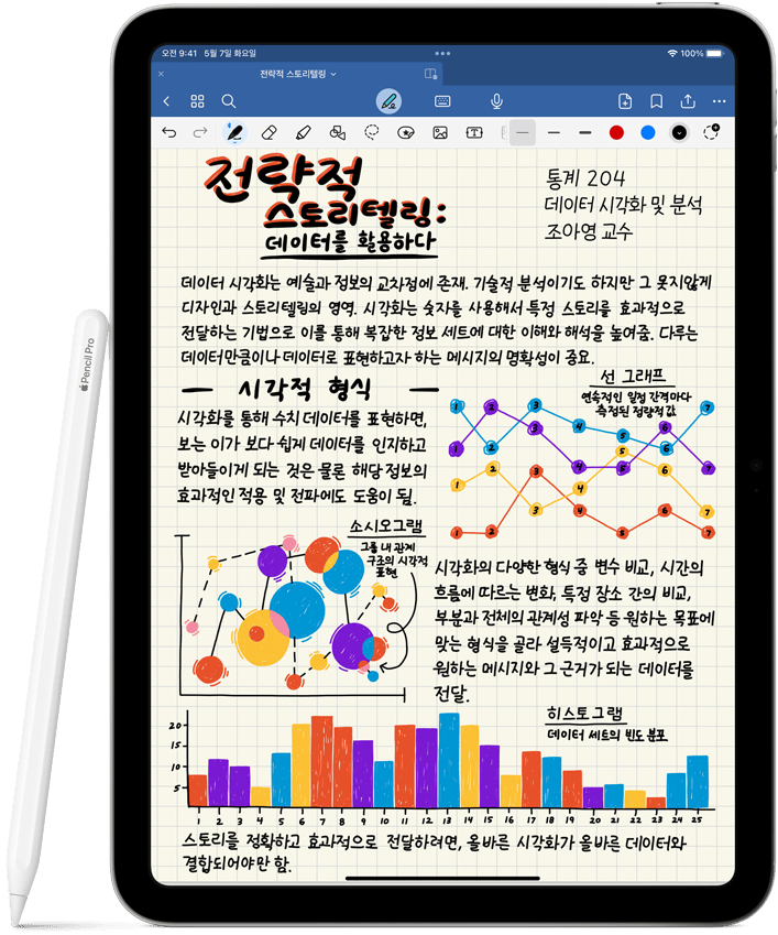 Apple Pencil Pro를 톡톡 두드리는 두 번 탭 제스처로 펜과 지우개 등 여러 도구 간 전환을 빠르게 실행할 수 있습니다.