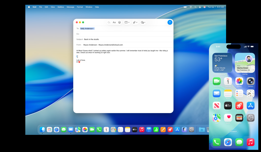 iPhone 16 Plus, MacBook Air รุ่น 13 นิ้ว, แอปเมลที่เปิดอยู่, อีเมลร่างฉบับเดียวกันแสดงอยู่บนทั้งสองหน้าจอ